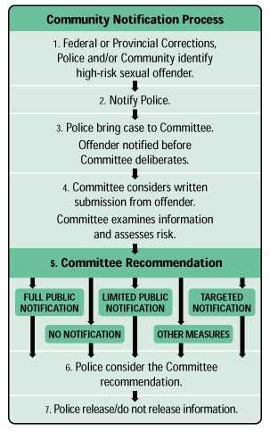 When a police agency learns that a potentially dangerous convicted sexual offender is about to be released from jail, or is already living in the community, the situation is investigated to determine if the offender poses a threat to commit another sexual offence. If the police believe a threat exists, they refer the case to the committee for a recommendation about whether the public should be warned. Offenders are told that their case has been referred to the committee and that a public notification may be made. They are given an opportunity to make a written submission to the committee or get someone to do so on their behalf.