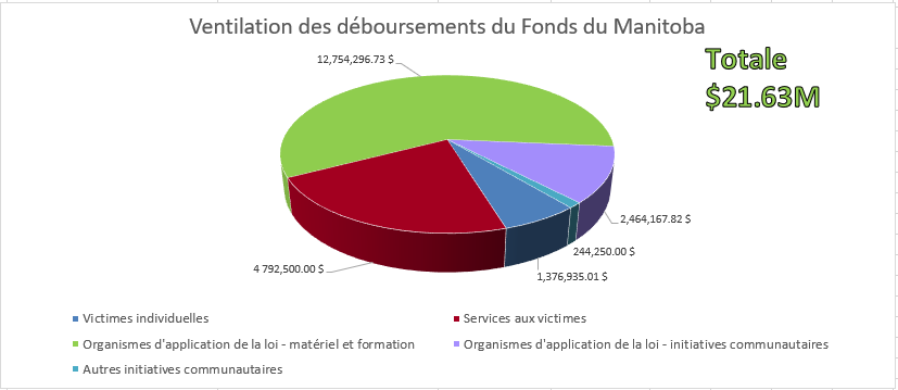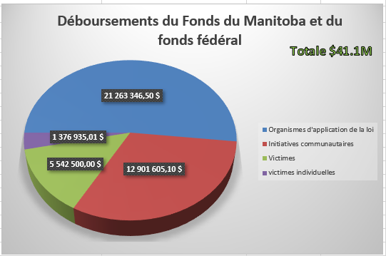 Les sommes d’argent et le produit de la vente des biens confisqués sont déposés dans le Fonds de confiscation des biens obtenus ou utilisés criminellement (le Fonds du Manitoba). Ils servent ensuite :