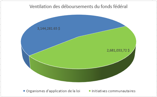 Les montants indiqués sont les déboursements combinés versés à 16 organismes d’application de la loi provinciaux et municipaux. On distingue les sommes versées aux organismes d’application de la loi qui parrainent des initiatives ou des programmes communautaires.