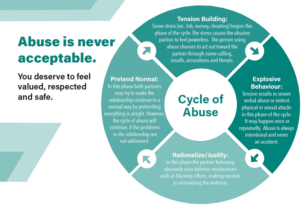 Sometimes abusive behaviours present themselves gradually, over time and sometimes are hard to recognize as abuse. The Cycle of Abuse can help you understand how behaviours and events fit together.