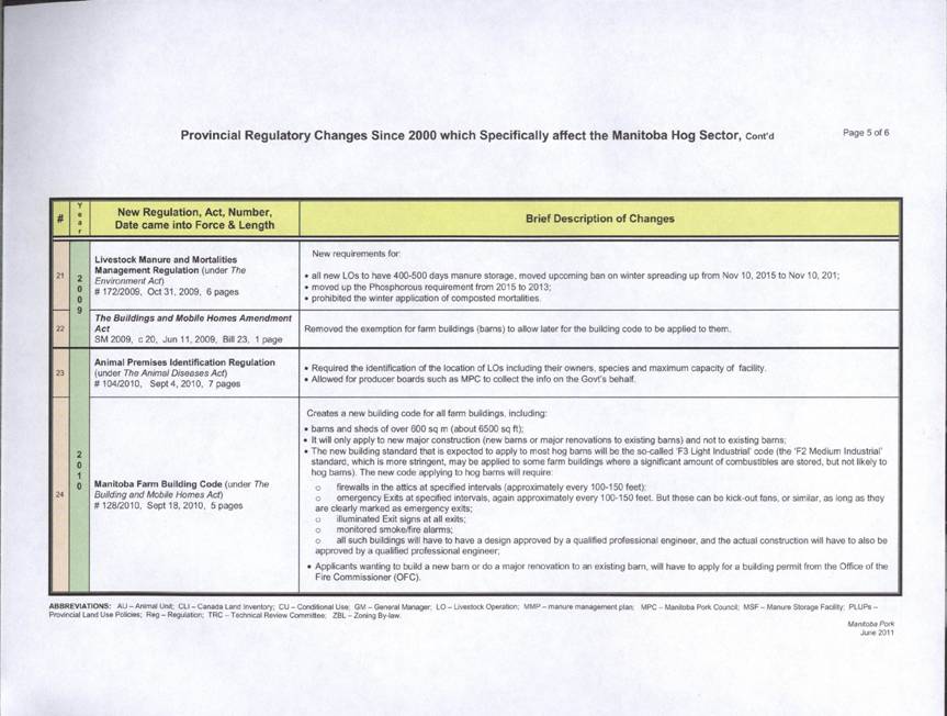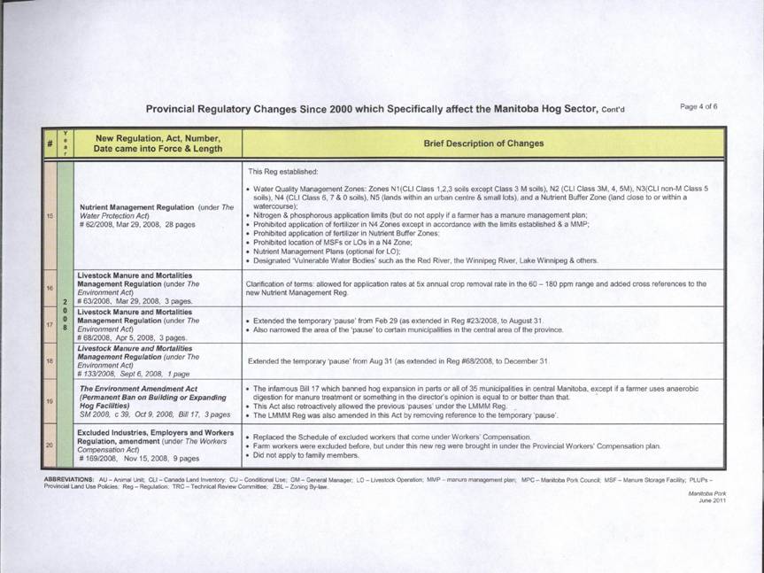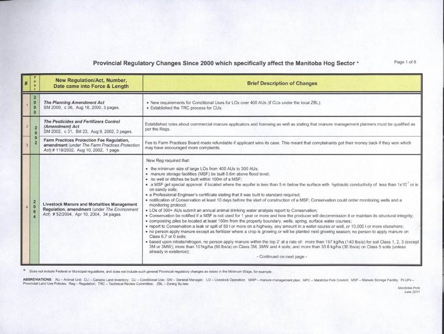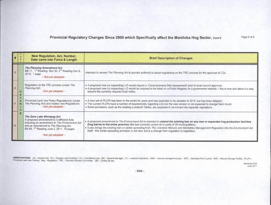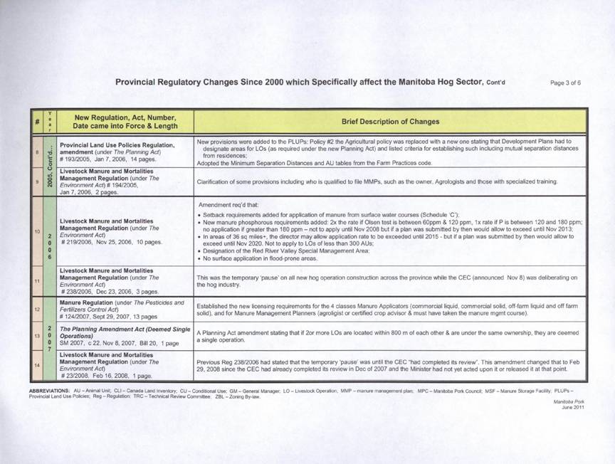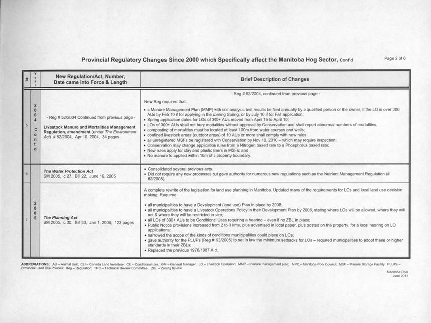 We would also like you to consider the damage that moving forward with Bill 46, as written, may cause our provincial agricultural sector, family farms and Lake Winnipeg. We recommend to committee that at minimum, part two, dealing with the changes subsection 40.1(1) to The Environment Act, prohibiting confined livestock areas and manure storage facilities for pigs, be removed entirely from this bill. This amendment effectively extends the entire–effectively extends the entire province–the moratorium on the hog sector expansion that was passed in 2008 through Bill 17, The Environment Amendment Act.