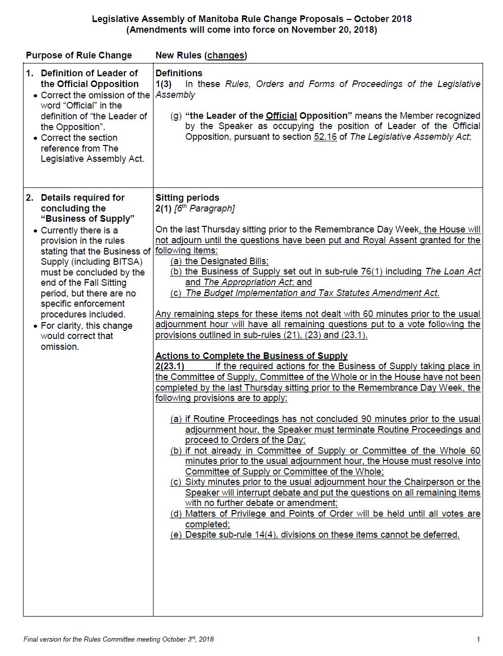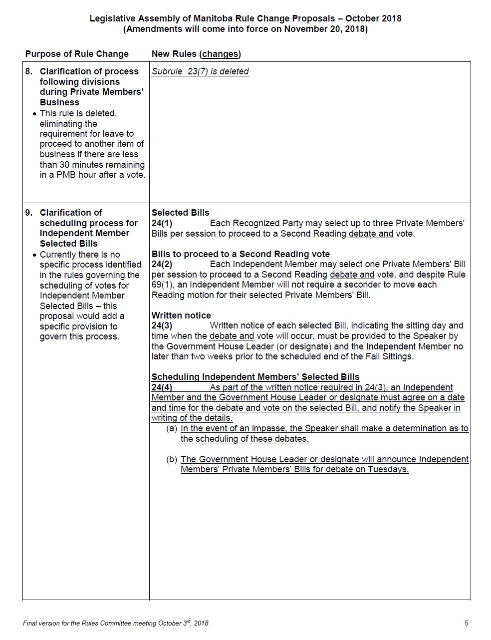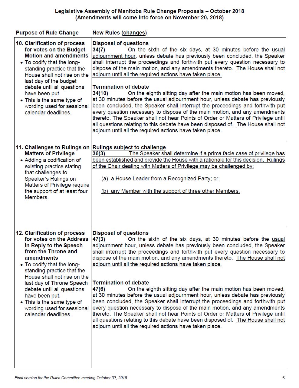 You will find before you copies of a document entitled Legislative Assembly of Manitoba Rule Change Proposals, October 2018, which we will be considering today. The French text of the proposed rules is also provided for you.