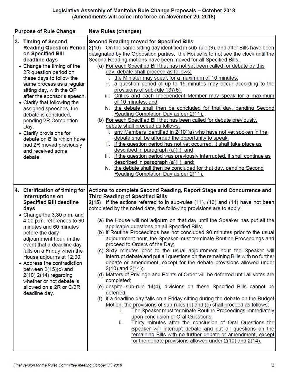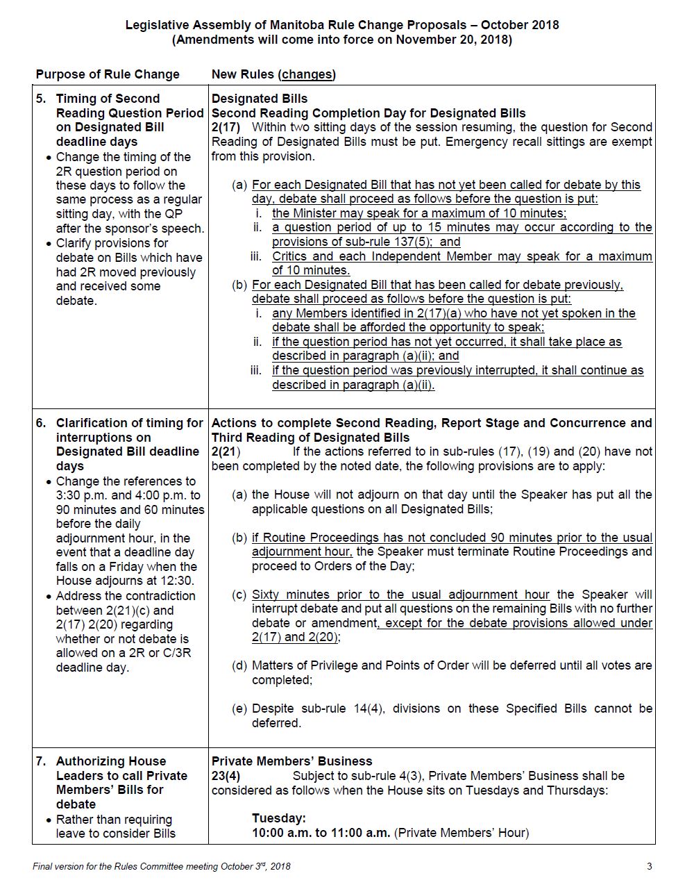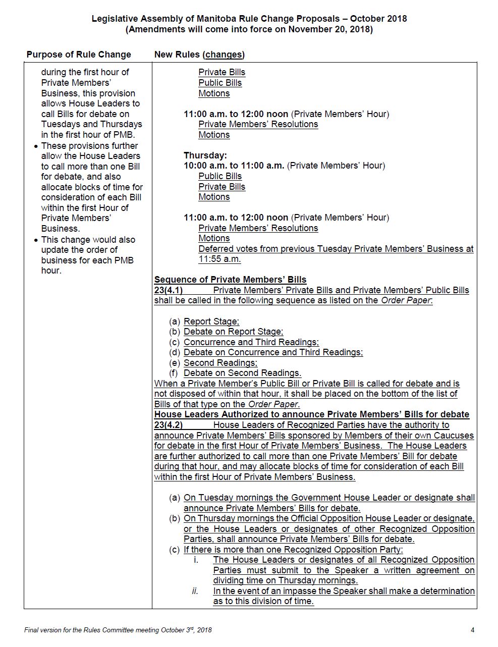 You will find before you copies of a document entitled Legislative Assembly of Manitoba Rule Change Proposals, October 2018, which we will be considering today. The French text of the proposed rules is also provided for you.