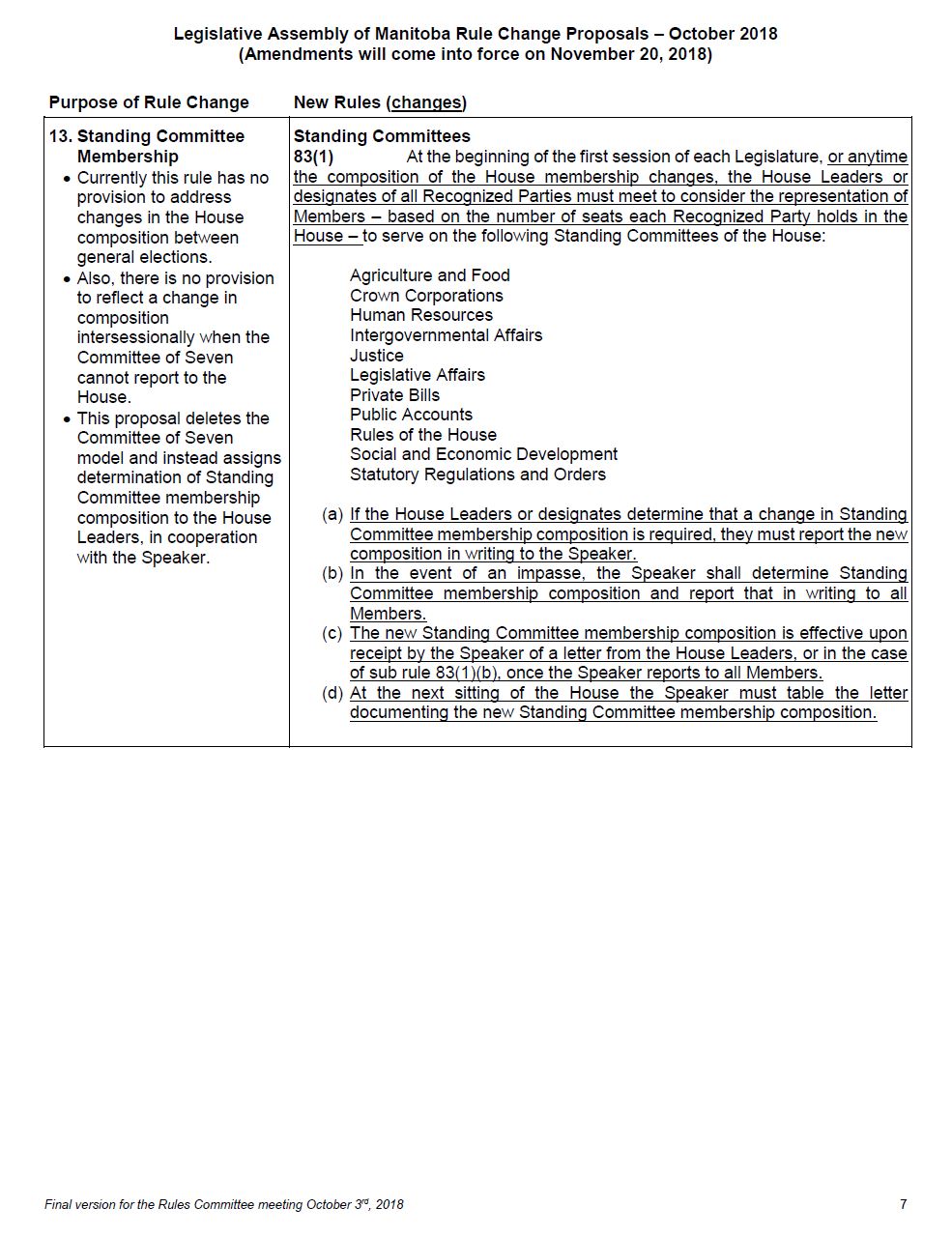 So the proposal deletes the committee of seven model and instead assigns determination of standing committee membership composition to the House leaders in co-operation with the Speaker. It also specifies that not all changes in House composition would necessarily mean changes in committee composition. Now, I'll just go through some of the wording of the rule to explain what I mean by this.