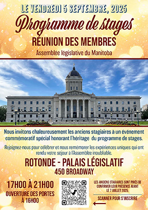 Nous sommes heureux d’annoncer que nous planifions une réunion des membres du programme de stages de l’Assemblée législative du Manitoba le 5 septembre 2025. Nous serions heureux que vous vous joigniez à nous en vue de cette célébration et pour vous remémorez les expériences uniques que vous avez vécues pendant votre stage à l’Assemblée. Il s’agira d’une merveilleuse occasion de reprendre le contact avec de vieux amis, d’échanger des souvenirs et d’assister à un événement spécial dédié aux stagiaires qui ont participé à ce programme exceptionnel au fil des années.