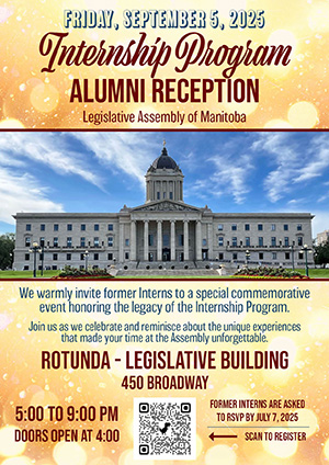 We are pleased to announce that we are planning a Legislative Assembly of Manitoba Internship Program Reunion Event on September 5, 2025. We would love for you to join us to celebrate and reminisce about the unique experiences you had during your time at the Assembly. This will be a wonderful opportunity to reconnect with old friends, share memories, and enjoy a special event dedicated to the Interns over the years who have been part of this exceptional program.
