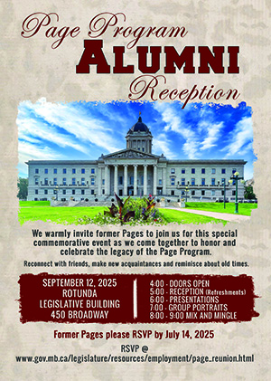 We are pleased to announce that we are planning a Legislative Assembly of Manitoba Page Reunion Event on September 12, 2025. We would love for you to join us to celebrate and reminisce about the unique experiences you had during your time at the Assembly. This will be a wonderful opportunity to reconnect with old friends, share memories, and enjoy a special event dedicated to the Pages over the years who have been part of this exceptional program.