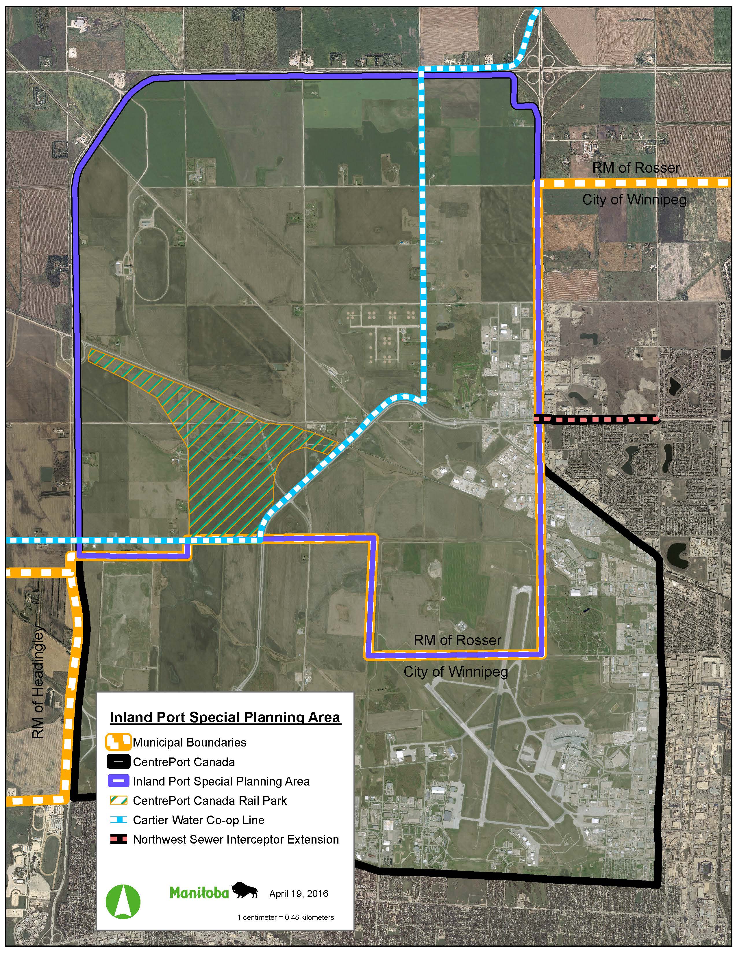 It is located adjacent to the Winnipeg James Armstrong Richardson International Airport, with CentrePort North within the Rural Municipality of Rosser and CentrePort South within the City of Winnipeg.  CentrePort North is a designated special planning area under The Planning Act, with an Inland Port Special Planning Authority and a streamlined land-development approval process.