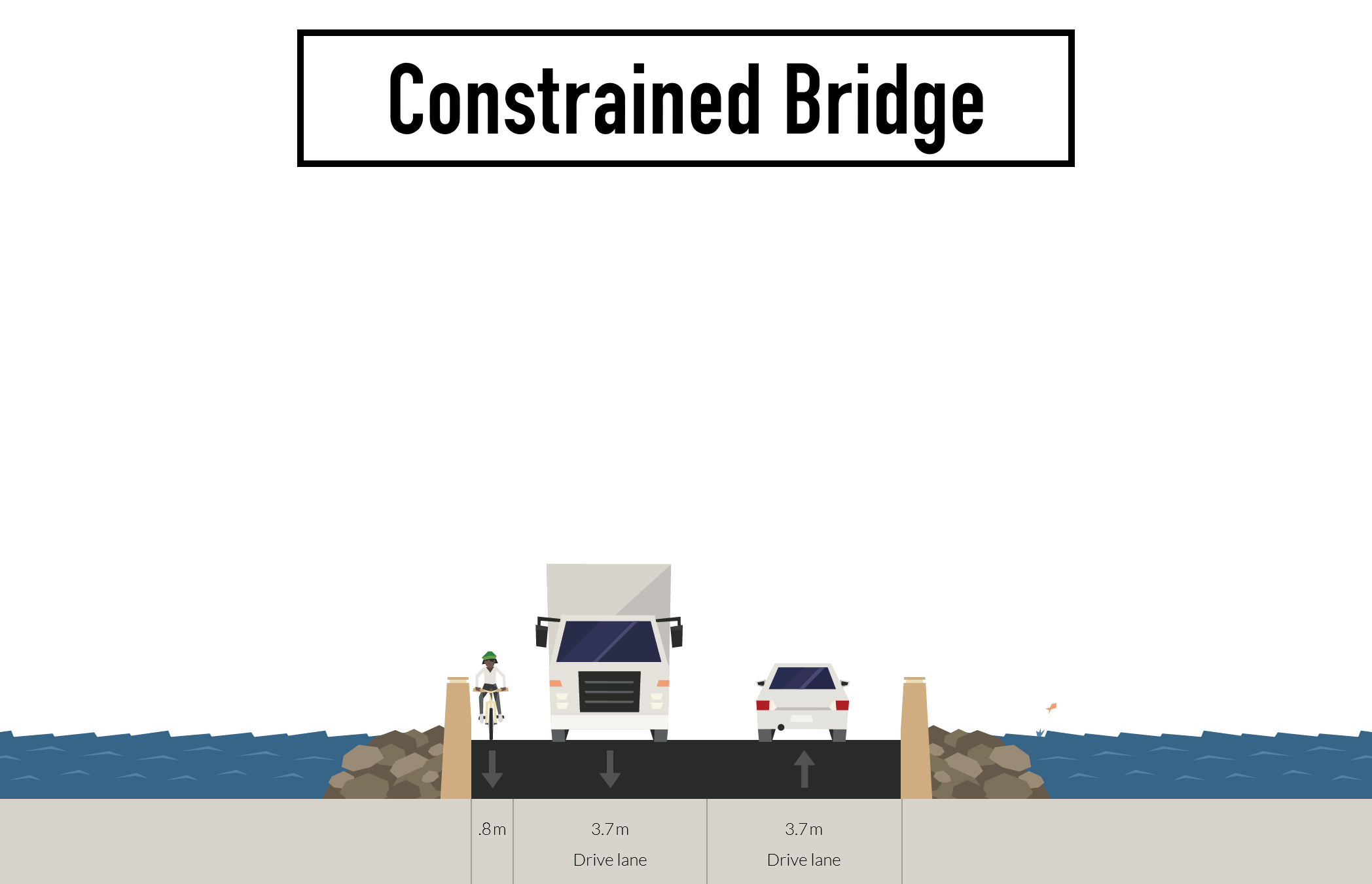 - Cyclists and pedestrians should be aware of traffic and shoulder conditions on constrained bridges and structures. Constrained structures include bridges, overpasses and other structures that have a shoulder of less than 1.2 m and do not have a sidewalk. On constrained structures, there is no safe refuge for cyclists and pedestrians, creating additional risk for all highway users (see image below).