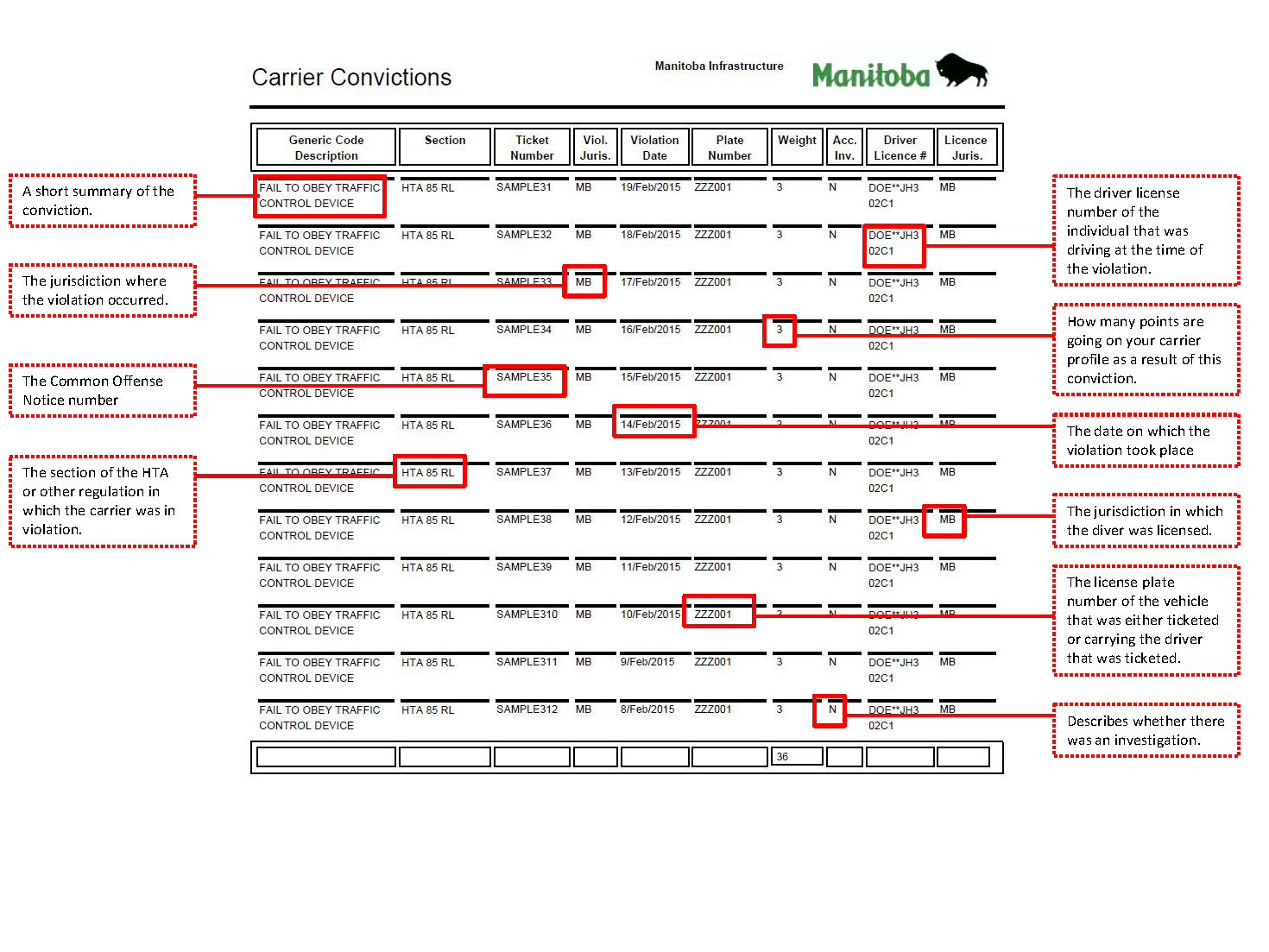 Any convictions against the carrier and/or the drivers occurring anywhere in Canada or the United States will be recorded on the Carrier Profile. These may include moving violations, violations relating to load securement, Hours of Service, and any other violations of the Highway Traffic Act. The convictions are listed in reverse chronological order, and they show the date and jurisdiction where the incident occurred, and the vehicle and driver involved.