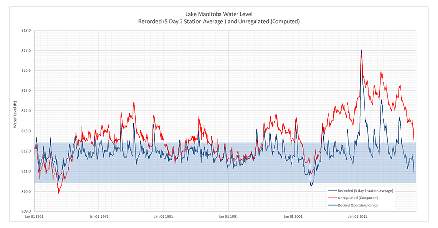 - The desired regulation range on Lake Manitoba is 812.5 feet (ft) to 810.5 ft. The desired regulation range on Lake St. Martin is 797.0 ft to 800.0 ft.
