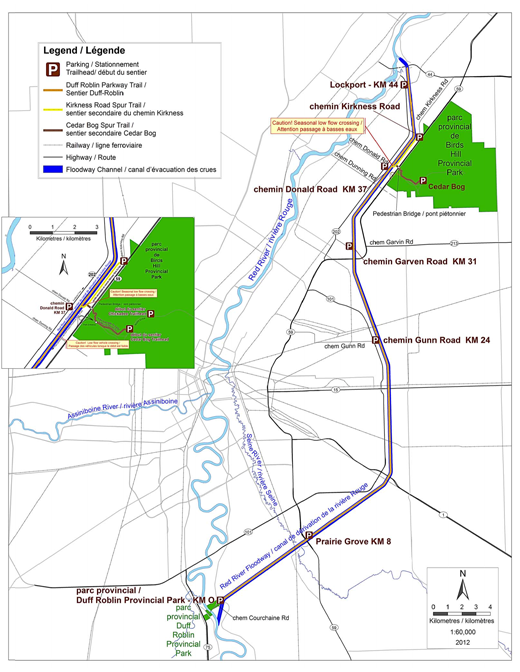 The Manitoba government constructed the Duff Roblin Parkway Trail as part of the floodway expansion project. The trail supports multi-use, non-motorized, four-season recreational opportunities along the floodway including walking, hiking and biking, cross-country skiing and snowshoeing. The public can walk, run, bike or ski as much or as little of the trail as they like. Along the way, users will follow the floodway channel and will have an opportunity to see wildlife, vegetation and agricultural land.