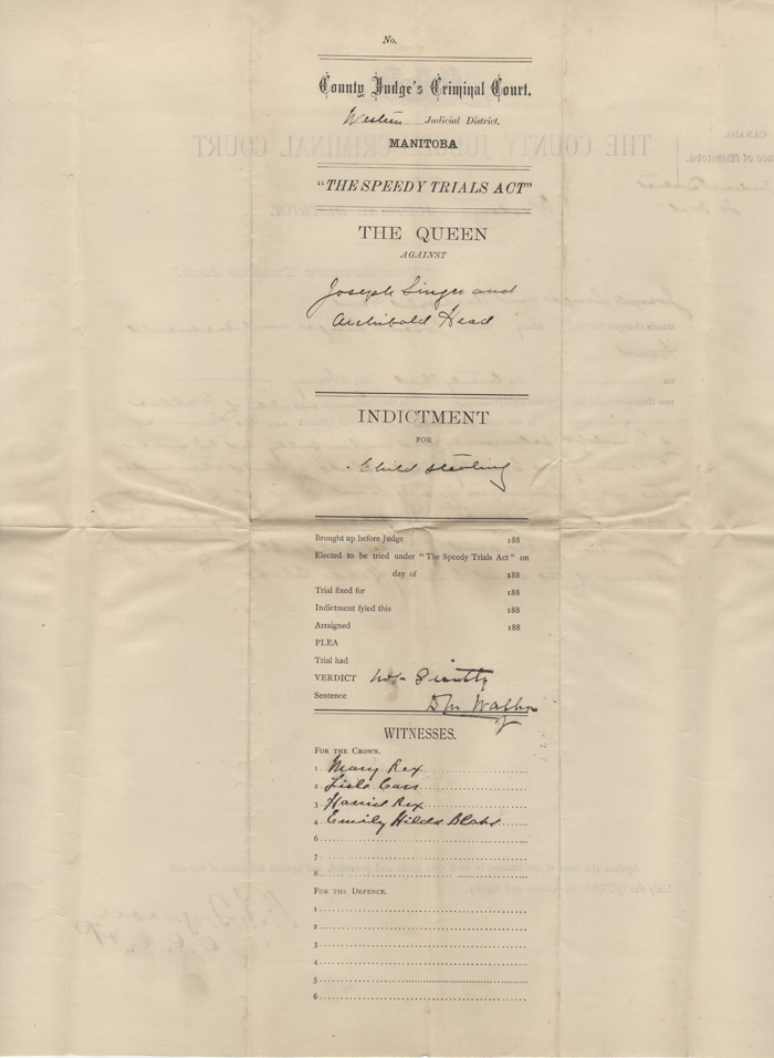 Queen vs. Joseph Singer and Archibald Head trial, page 1.