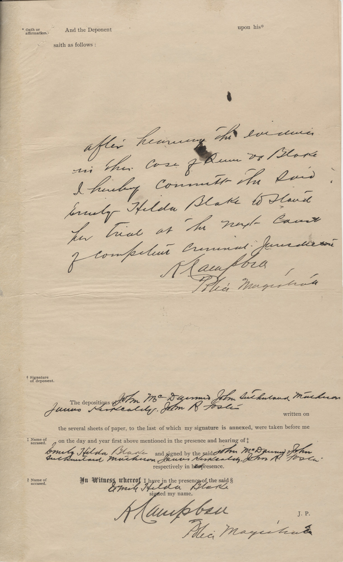 Deposition of Witnesses in the Emily Hilda Blake murder case, page 7.