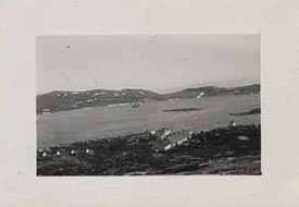 Hebron, showing harbor and "Nascopie." The long building was a former Moravian Mission - now used by the English missionary and H.B.C. post manager, and still many unused rooms. |