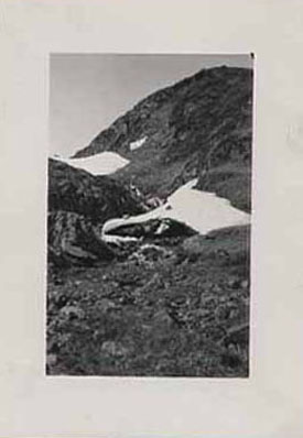 Natural ice bridge. We could not break it. A stream was pouring down under it from a lake higher up. The snow was deep and hard here. |