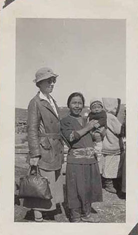 Miss Strang and Eskimo woman and her baby, Simeon Nicodemus. "White man's" clothing except sealskin boots (komicks) [kamiks]. |