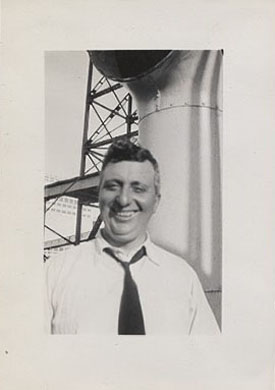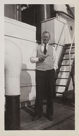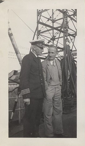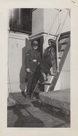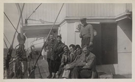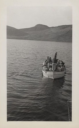 Boat load of Eskimos being transferred from the Nascopie on a lighter. Second officer Dobson standing on the back