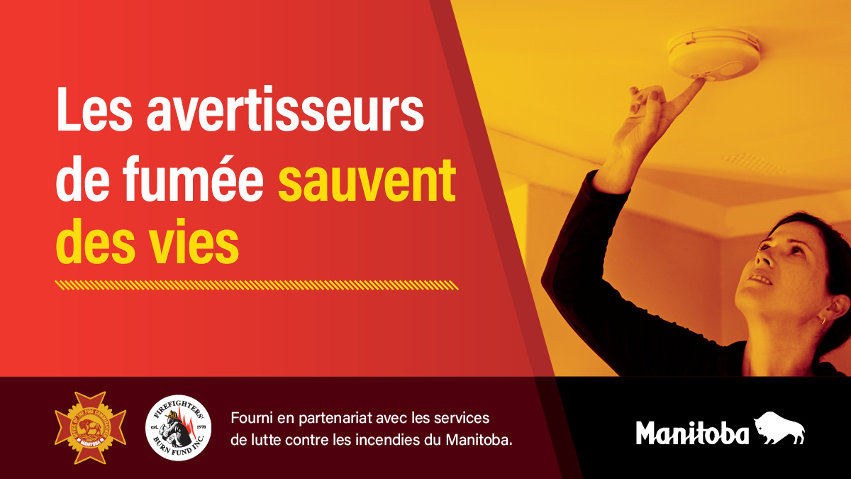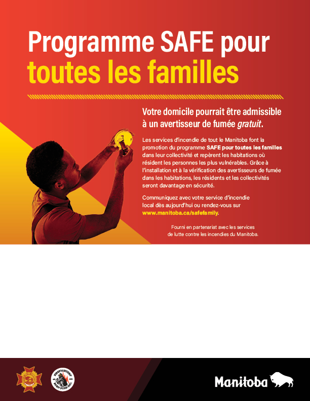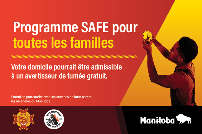 Les avertisseurs de fumée en état de marche sauvent des vies. Votre habitation pourrait être admissible à recevoir un avertisseur de fumée gratuit dans le cadre du programme SAFE pour toutes les familles. Communiquez avec votre service d’incendie local dès aujourd’hui pour en savoir plus ou rendez-vous sur le site www.manitoba.ca/safefamily.
