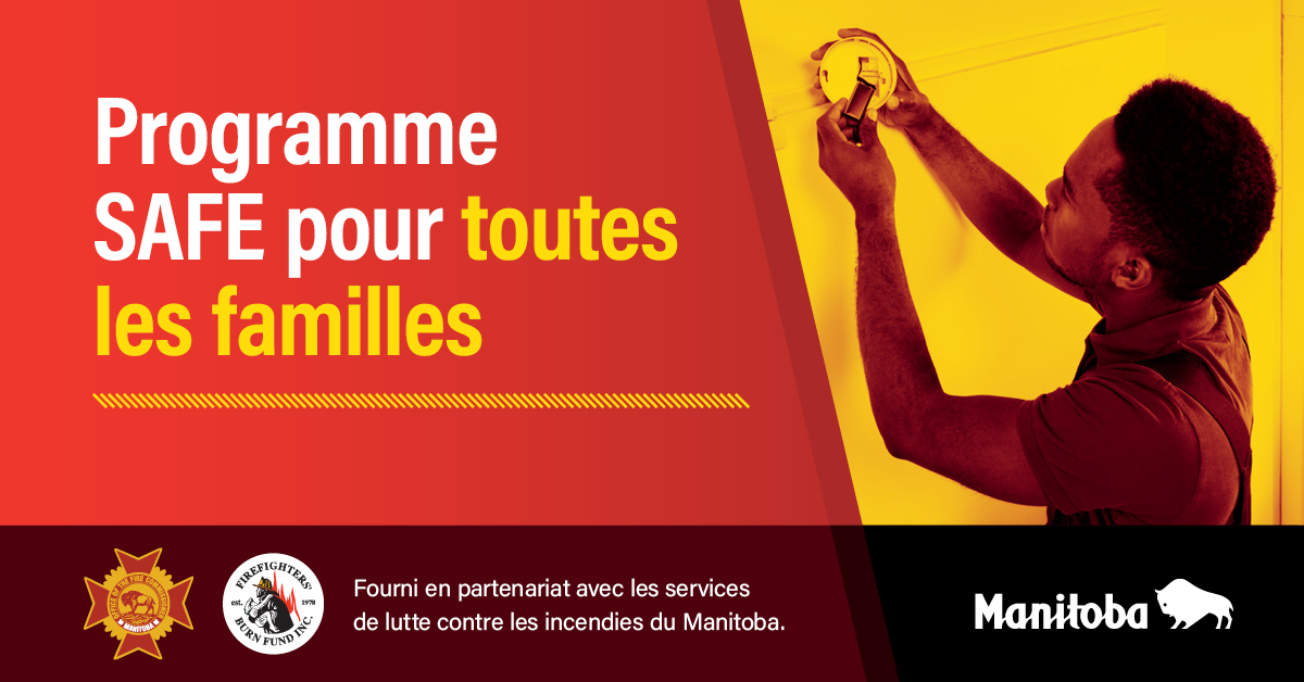 Le gouvernement du Manitoba, le Bureau du commissaire aux incendies et le Manitoba Firefighters’ Burn Fund présentent le programme SAFE pour toutes les familles. Ce programme vise à sauver des vies par l’installation d’un avertisseur de fumée en bon état de marche dans chaque habitation où logent des personnes vulnérables et à encourager les familles à élaborer et à mettre en pratique un plan d’évacuation.