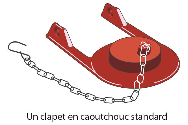 - Le type de clapet le plus courant est le clapet en caoutchouc standard : celui-ci se fixe généralement à la base du tube de trop-plein et se place au-dessus de l'ouverture du robinet de chasse. Il est relié à une chaîne qui soulève le clapet lorsque la chasse d'eau est tirée.