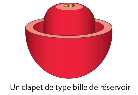 - Un clapet de type bille de réservoir est facile à repérer, car il s'agit pour l'essentiel d'une petite boule en caoutchouc qui se place dans l'orifice qui se trouve à la base du réservoir des toilettes, comme un bouchon de toilette.