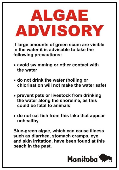 Algae advisory signs let swimmers know that blue-green algae or cyanobacteria have exceeded Manitoba's recreational water quality objective for cyanobacterial cell count of 100,000 cells per mL this season ( Water Science and Management Branch, 2011).