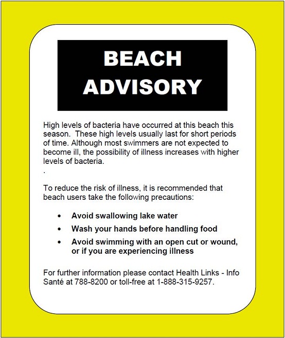 Yellow advisory signs let swimmers know that elevated bacteria counts have exceeded Manitoba's recreational water quality objective of 200 E. coli per 100mL this season (Water Science and Management Branch, 2011). Elevated bacteria densities usually last for short periods of time. Although most swimmers are not expected to become ill, the possibility of illness increases with elevated bacterial densities. To reduce your risk of illness, the following precautions are recommended: