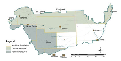 The Boyne-Morris integrated watershed management plan encompasses the area of land that contributes water to the Boyne and Morris Rivers including tributaries such as the Roseisle, Tobacco, and Shannon Creeks. The La Salle Redboine and Pembina Valley Conservation Districts are leading plan development in partnership with the Provincial government and a team of supporting agencies, interest groups and watershed residents. |