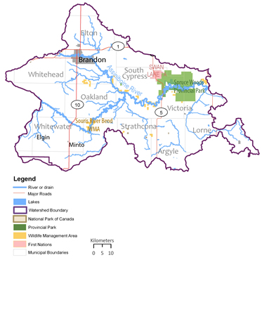 The Central Assiniboine and Lower Souris River integrated watershed management plan encompasses the area of land that contributes water to the Assiniboine River including tributaries such as the Souris River, Cypress River and Oak Creek. The Assiniboine Hills Conservation District is leading plan development in partnership with the Provincial government and a team of supporting agencies, interest groups and watershed residents. |