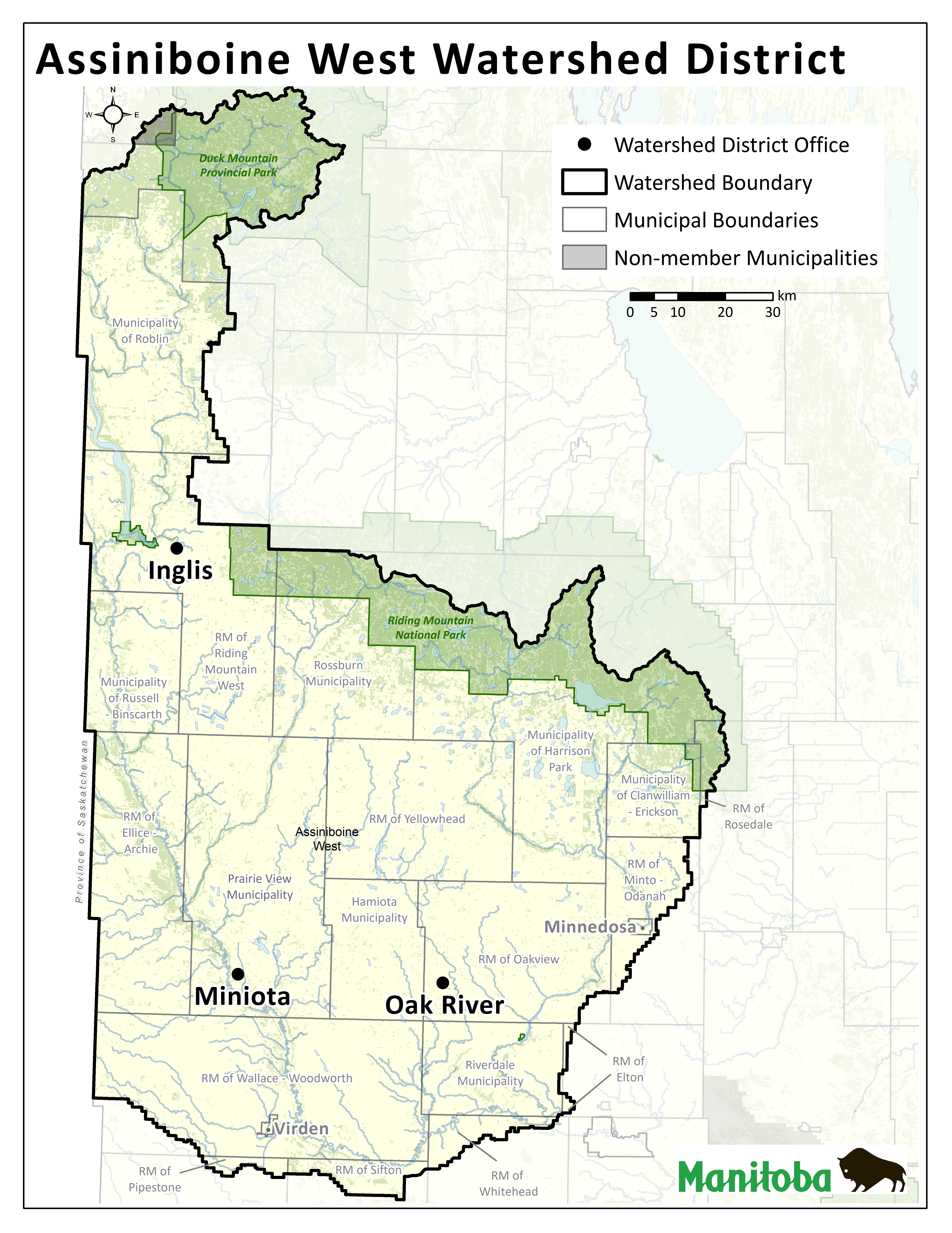 The Assiniboine West Watershed District operates from three offices with the main office in Miniota and satellite offices in Oak River and Inglis.