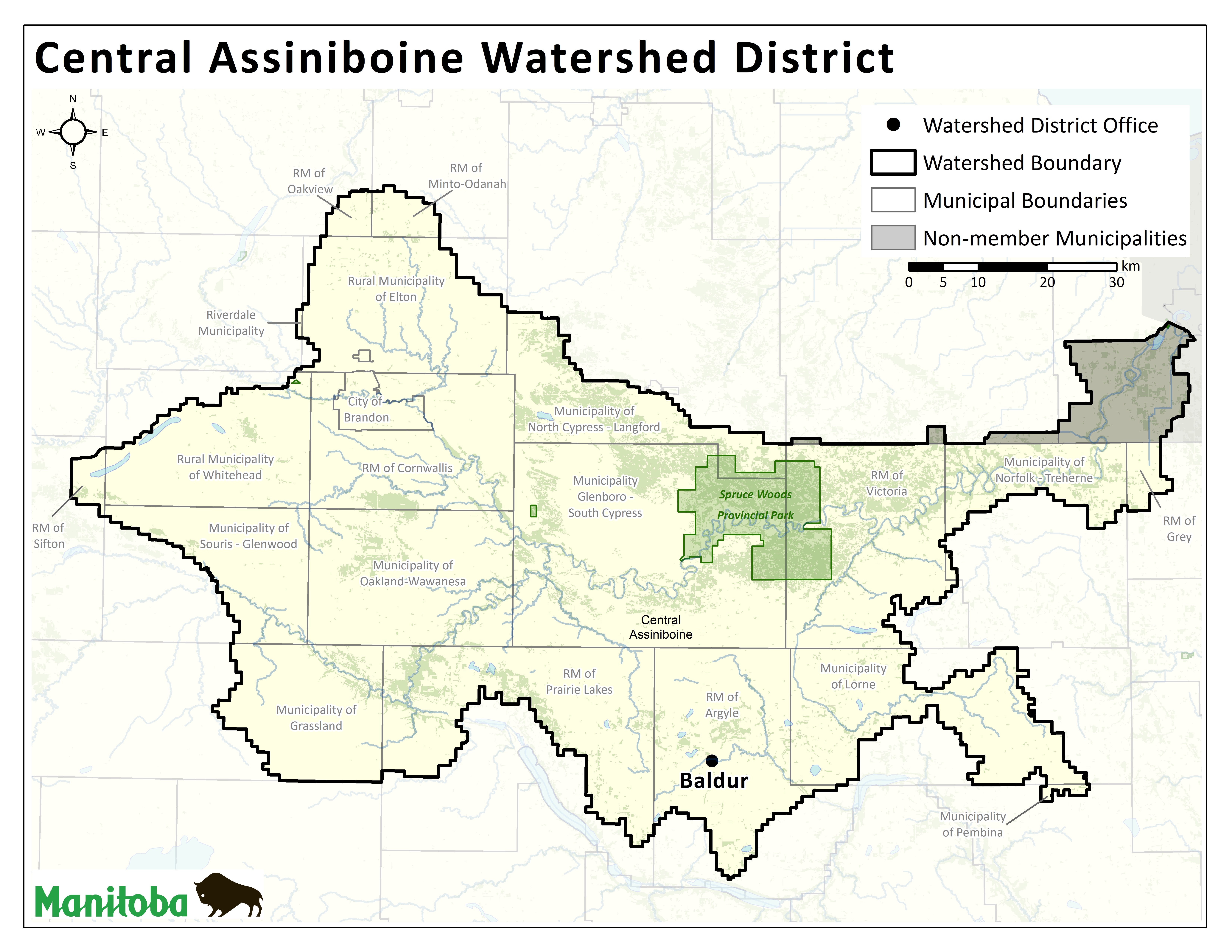 The Central Assiniboine Watershed District was established in 2008 (formerly the Assiniboine Hills Conservation District). The district occupies the municipalities of Argyle, Lorne, Grey, Norfolk-Treherne, Victoria, Cornwallis, Glenboro-South Cypress, Grassland, Oakland-Wawanesa, Prairie Lakes, and Souris-Glenwood, Sifton and Riverdale. It also includes the City of Brandon. Along with its partners, the district is committed to managing water and environmental resources to promote a healthy watershed and a sustainable lifestyle for current and future generations. This will lead to a future where communities, Environment and Climate Change and the environment are healthy, sustainable and in balance with one another. Land and water programming offered by the district focuses on the goals included in the Central Assiniboine and Lower Souris River integrated watershed management plan.