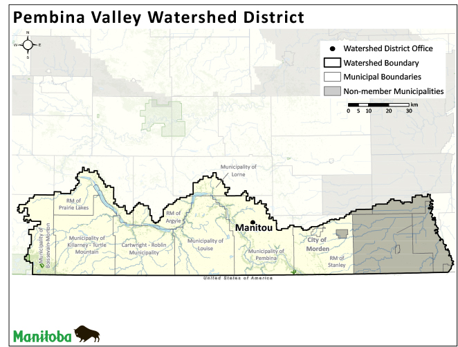The Pembina Valley Watershed District is in south-central Manitoba with its southern border adjacent to the Canada – US border stretching from the Red River in the east and includes the Turtle Mountains to the west. Municipal members include the municipalities of Boissevain-Morton, Cartwright-Roblin, Killarney-Turtle Mountain, Prairie Lakes, Argyle, Lorne, Louise, Pembina, Stanley and the City of Morden.