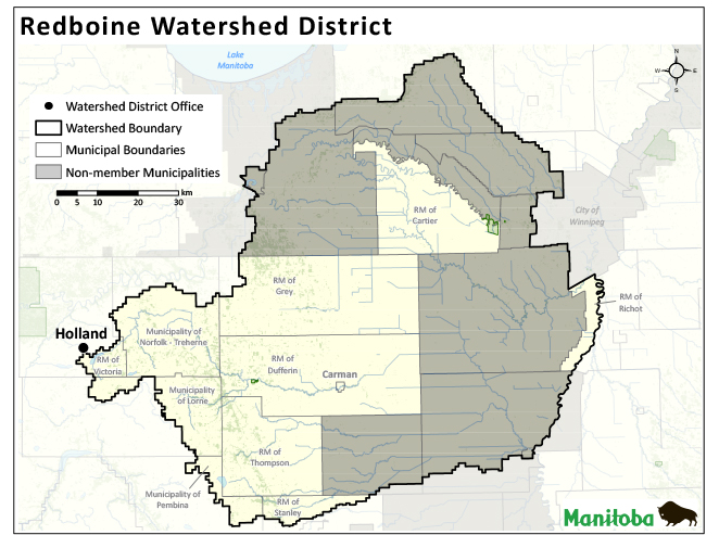 Redboine Watershed District is located in southern Manitoba and includes all or parts of the participating municipalities of Victoria, Norfolk Treherne, Dufferin, Grey, Cartier, Ritchot, Stanley, Thompson, Lorne and Pembina; and the Town of Carman. The district encompasses an area of approximately 5,200km² and was formed in 2002 as the LaSalle Redboine Conservation District. On January 1, 2020, through proclamation of the Watershed Districts Act, all of Manitoba’s 18 conservation districts transitioned to 14 new watershed districts, with boundaries based on watersheds.