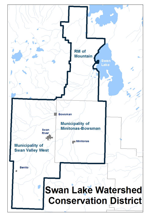 The Swan Lake Watershed Conservation District (SLWCD) was formed in 2006 and covers an area of 4,234 km². The district is located along the Saskatchewan border, between the Duck Mountains and the Porcupine Hills. The SLWCD includes the municipalities of Swan Valley West, Minitonas-Bowsman, and Mountain, as well as the Town of Swan River.