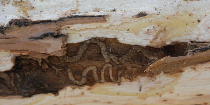 - C'est en fait la larve (à l'étape de la chenille), et non l'adulte, qui détruit les frênes. Dès l'éclosion, la larve perfore l'écorce et commence à se nourrir juste en dessous de l'écorce, dans le phloème (tissu conducteur d'aliments) de l'arbre, créant des galeries en formes de « S ».