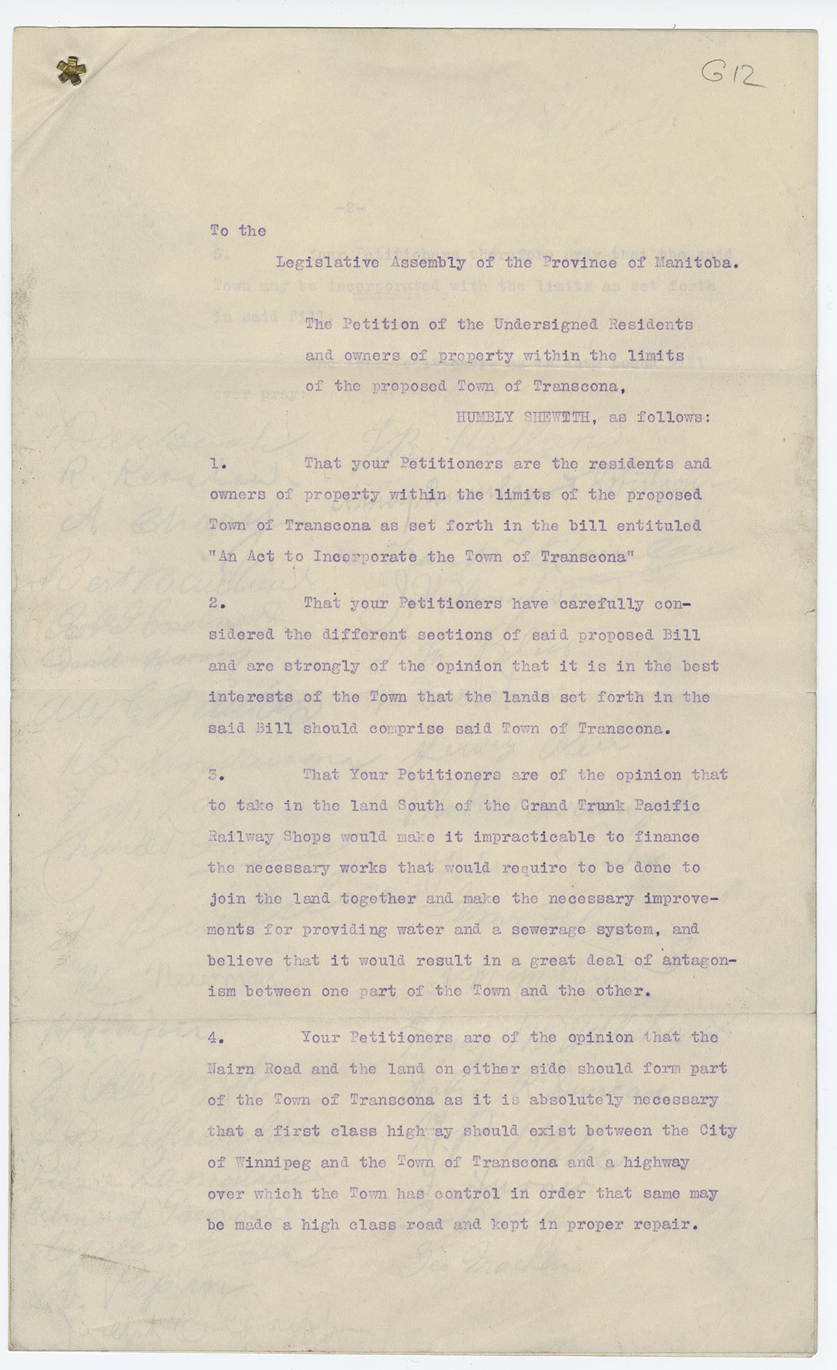 Archives of Manitoba, LA 0009, Sessional papers, Petition regarding incorporation of the Town of Transcona, 12 March 1912, G 8183