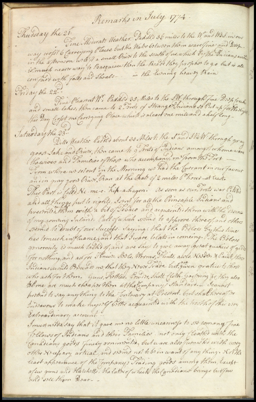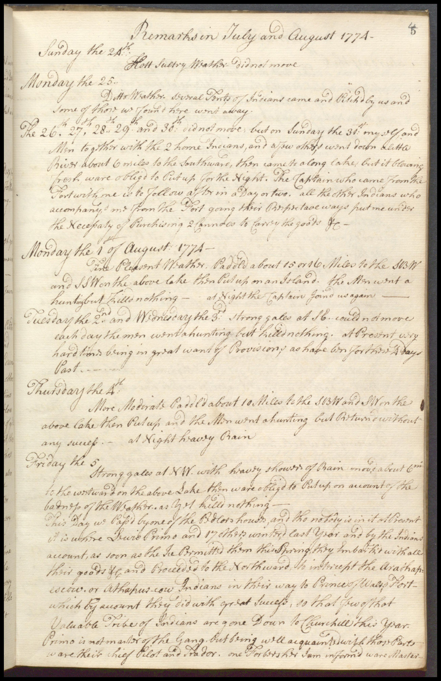 Hudson’s Bay Company Archives, Archives of Manitoba, Cumberland House post journal, July and August 1774, B.49/a/1 fos. 4d-5